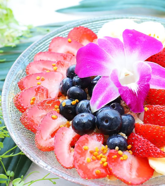 その上には、いちごやバナナなどのフレッシュフルーツをたっぷりトッピングしています。