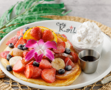 ふわっと軽いパンケーキに、たっぷりのフルーツをのせた贅沢な一皿です。