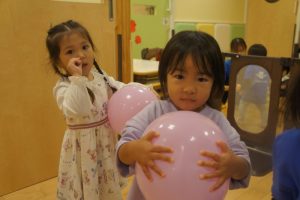 お友だちや保育者が膨らませた風船をポンポンと叩きながら