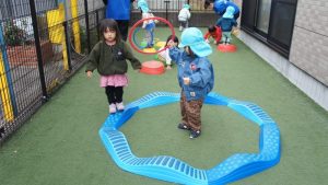お友だちと一緒にバランスビームを渡ってみようとしたり、
