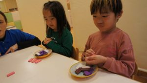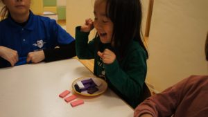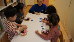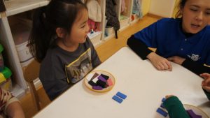 数で遊ぶゲームをしたり、ネイティブ講師に配られた色のブロックで、