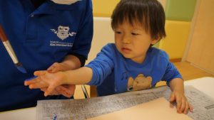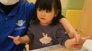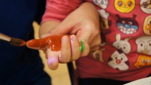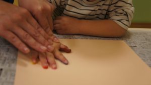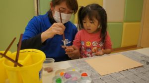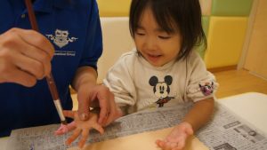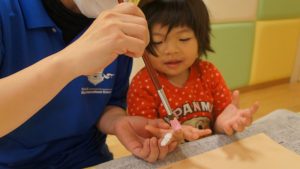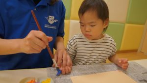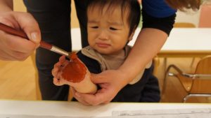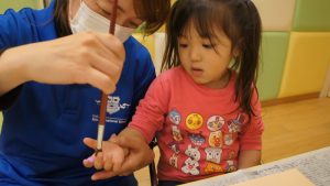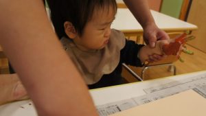 保育者に筆で塗ってもらうと嬉しそうに微笑む児や