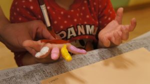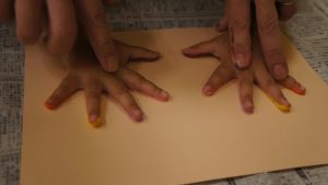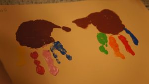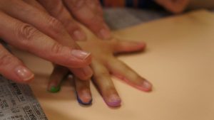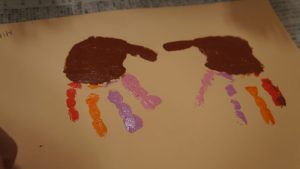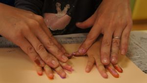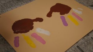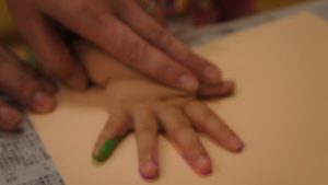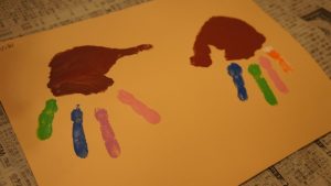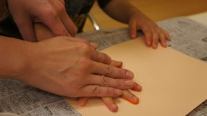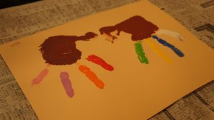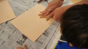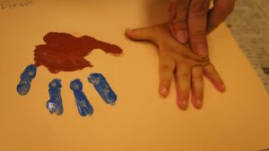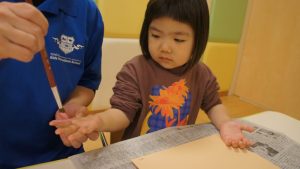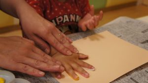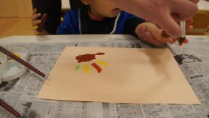 自分で選んで手形をとった鳥を見て嬉しそうに喜び、