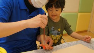 お友だちと完成したクラフトを見ながら『pink!blue!』などと色を発したり