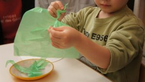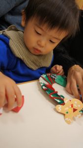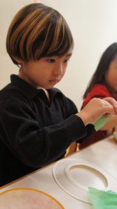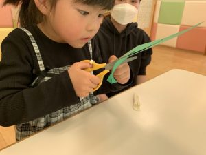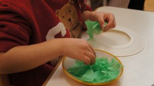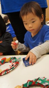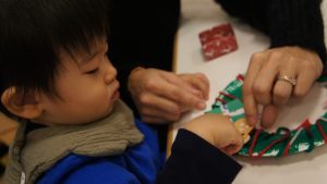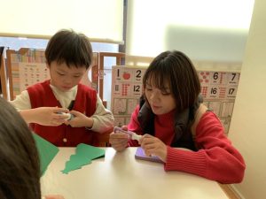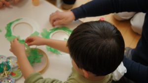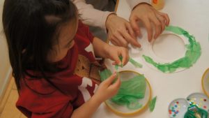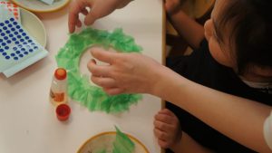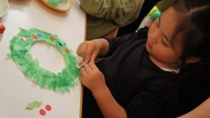 花紙をちぎってリースに貼り付けたり、小さく小さくちぎる児の姿もあれば、