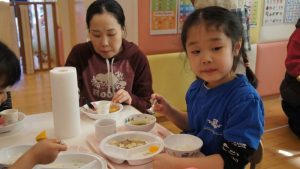『おいしいね!!』とお話ししながら給食を食べる姿があり