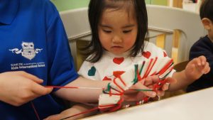 少しだけ巻いてある毛糸の上から追加で保護者の方と一緒に毛糸をぐるぐると巻き、
