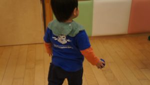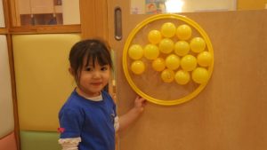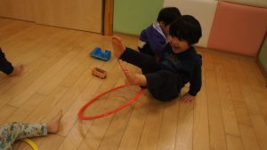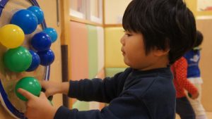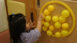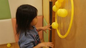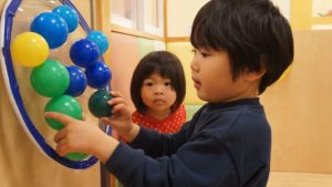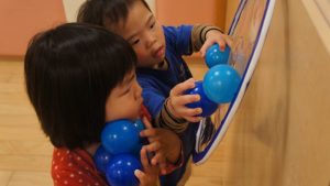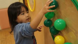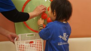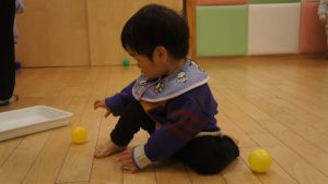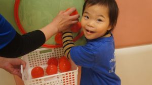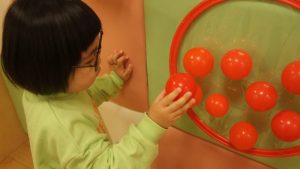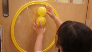 自分たちでボールの色を見極めながら同じ色のフラフープの場所に貼り付ける姿や