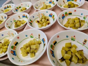 (写真は離乳食後期です。年齢によって形、固さ、盛り付け量を変えて、提供しています。)