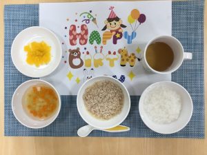 今日は、今年度最後のお誕生日会で、給食はみんなが大好きなミートローフでした!「おいしーい!」「おかわりください♪」と言いながらたくさん食べてくれました!(^^)!みんなで食べる給食の残りわずかです。大切に過ごしていきたいと思います。