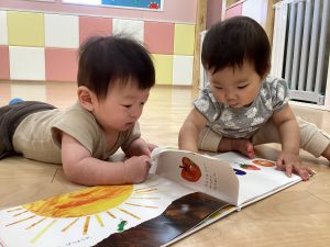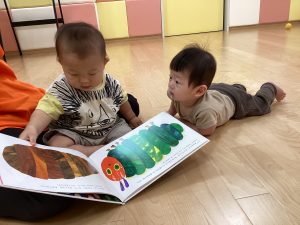 お気に入りの「はらぺこあおむし🐛」の絵本を上手にページをめくり見ていますね🥰