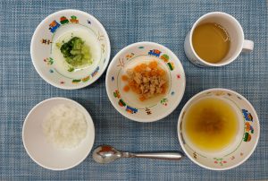 (写真は普通食です。年齢によって盛り付け量を変えて、提供しています。)