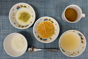 (写真は離乳食中期です。年齢によって盛り付け量を変えて、提供しています。)