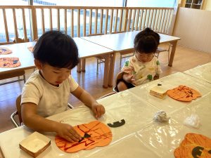 できたかぼちゃに目👀、口👄のパーツをノリで貼りました^_^