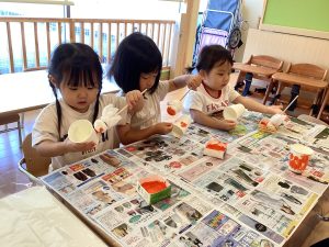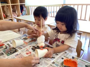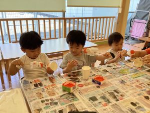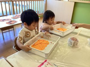 紙コップにタンポ筆でポンポンとかぼちゃの色を付けました🎃