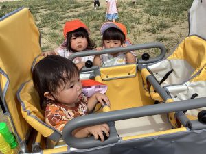 たくさん走って疲れたのか最後は「もう帰ろう」と言うかのようにバギーにきたので乗せてあげると他の子も来て乗せてもらうのを待っているいちご組さんした🍓
