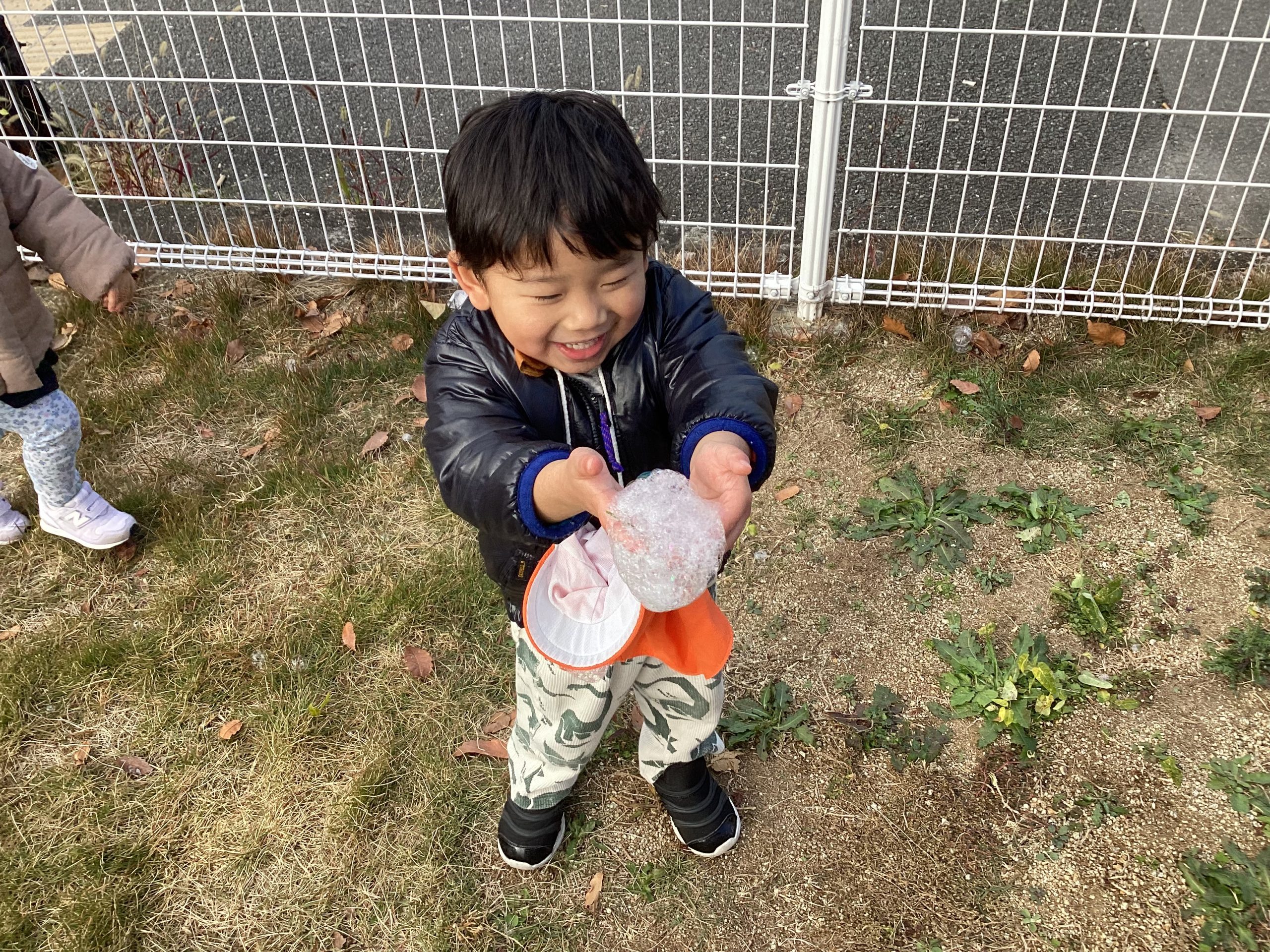 大きいシャボン玉から落ちた泡を手に乗せ嬉しそうにしていました🎵