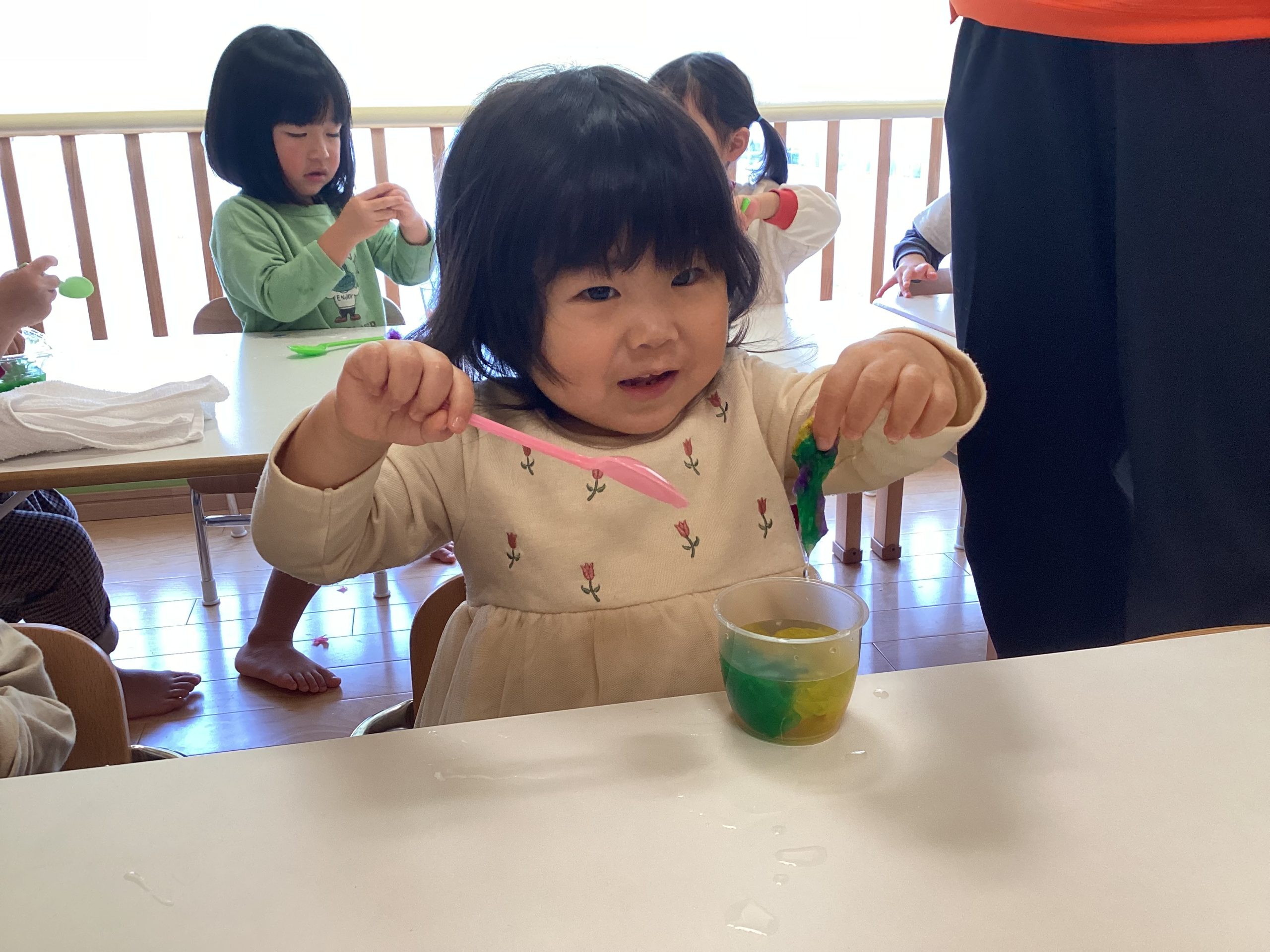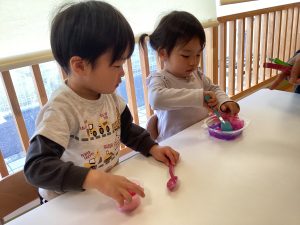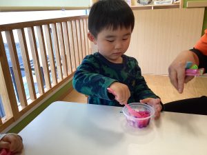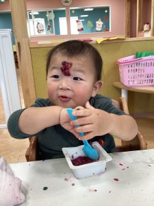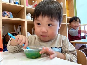 とても楽しかったようで混ぜている時にお花紙がおでこについている姿が可愛いですね😍