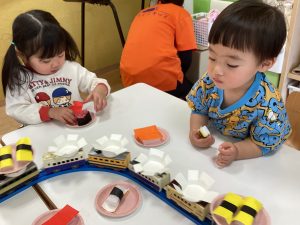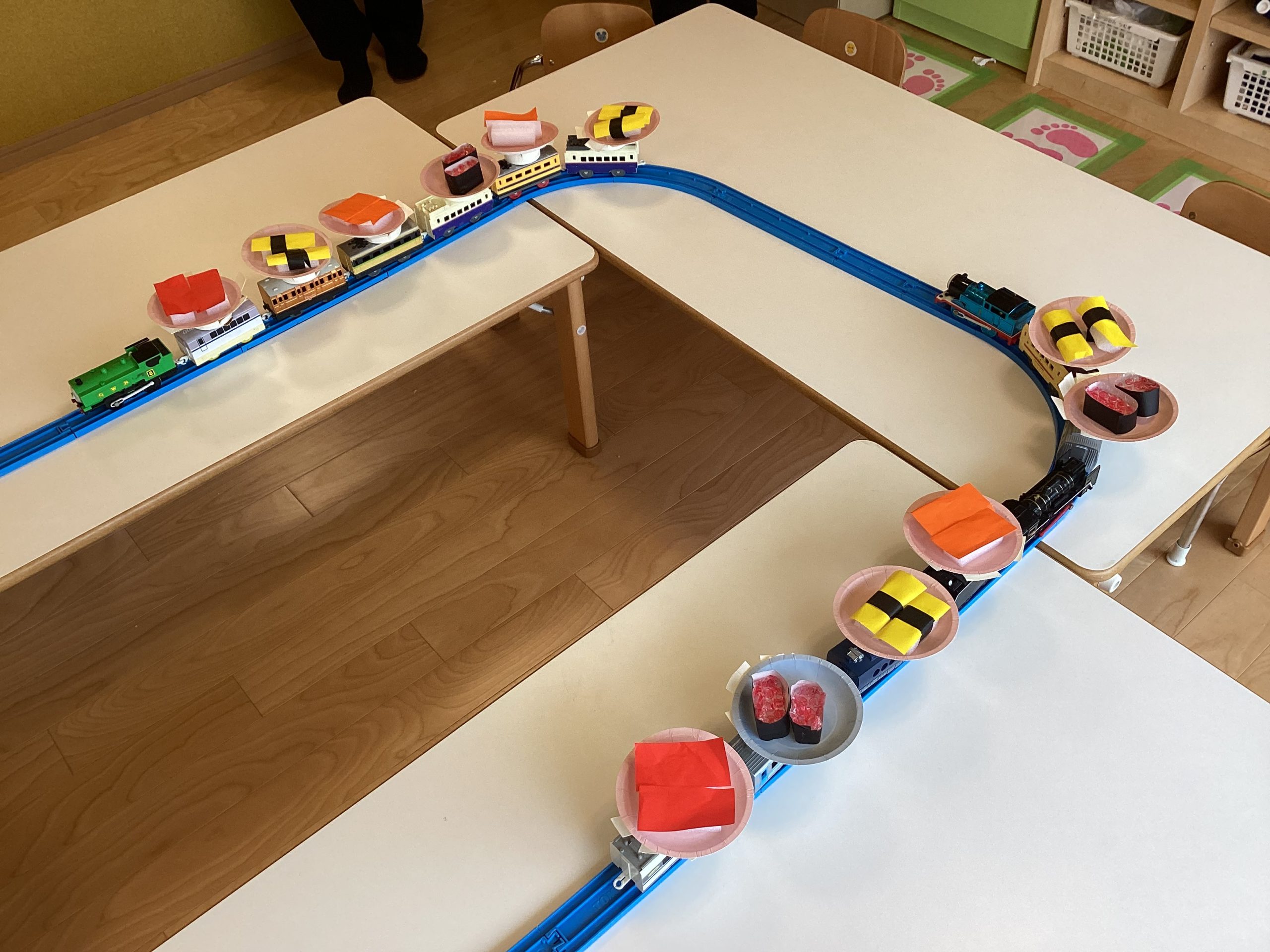 線路の上に電車が走り、サーモン、タマゴ、マグロ、いくらなどのお寿司がのっています🍣