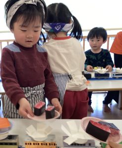 シャリの上にマグロやサーモンなどのネタをのせました🍣