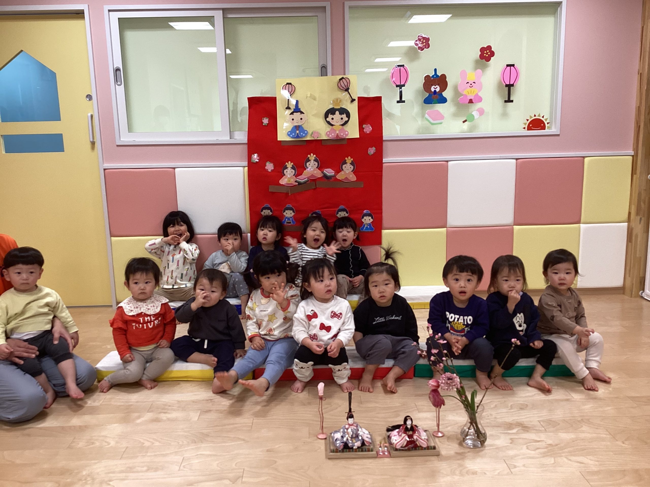 ひな祭りのお話しを聞き、みんなで壁にお雛様を飾りました🎎