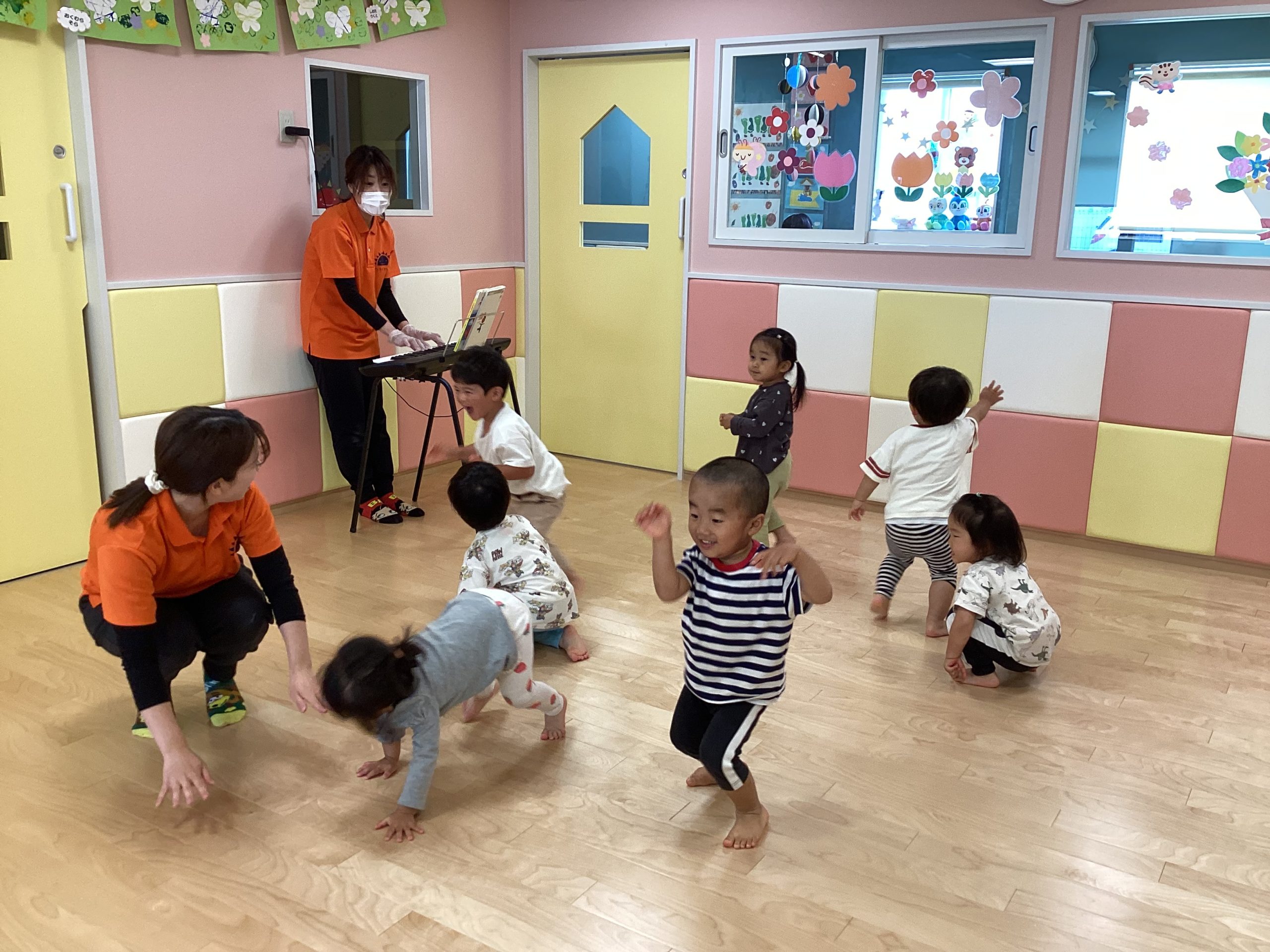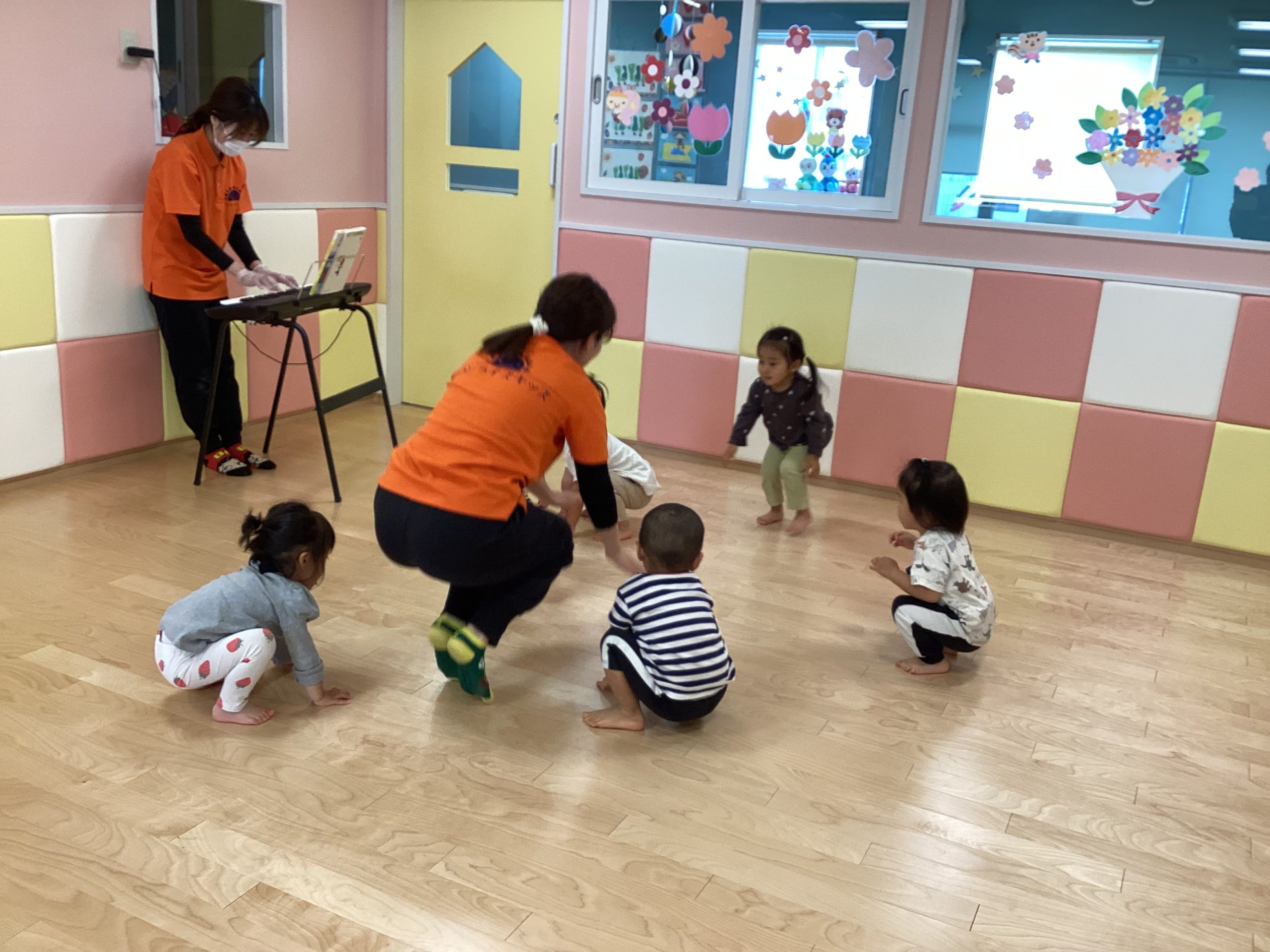 次はリズム遊びです💕ピアノ🎹の音が鳴ると子どもたちは自然に体がぴょんぴょん!