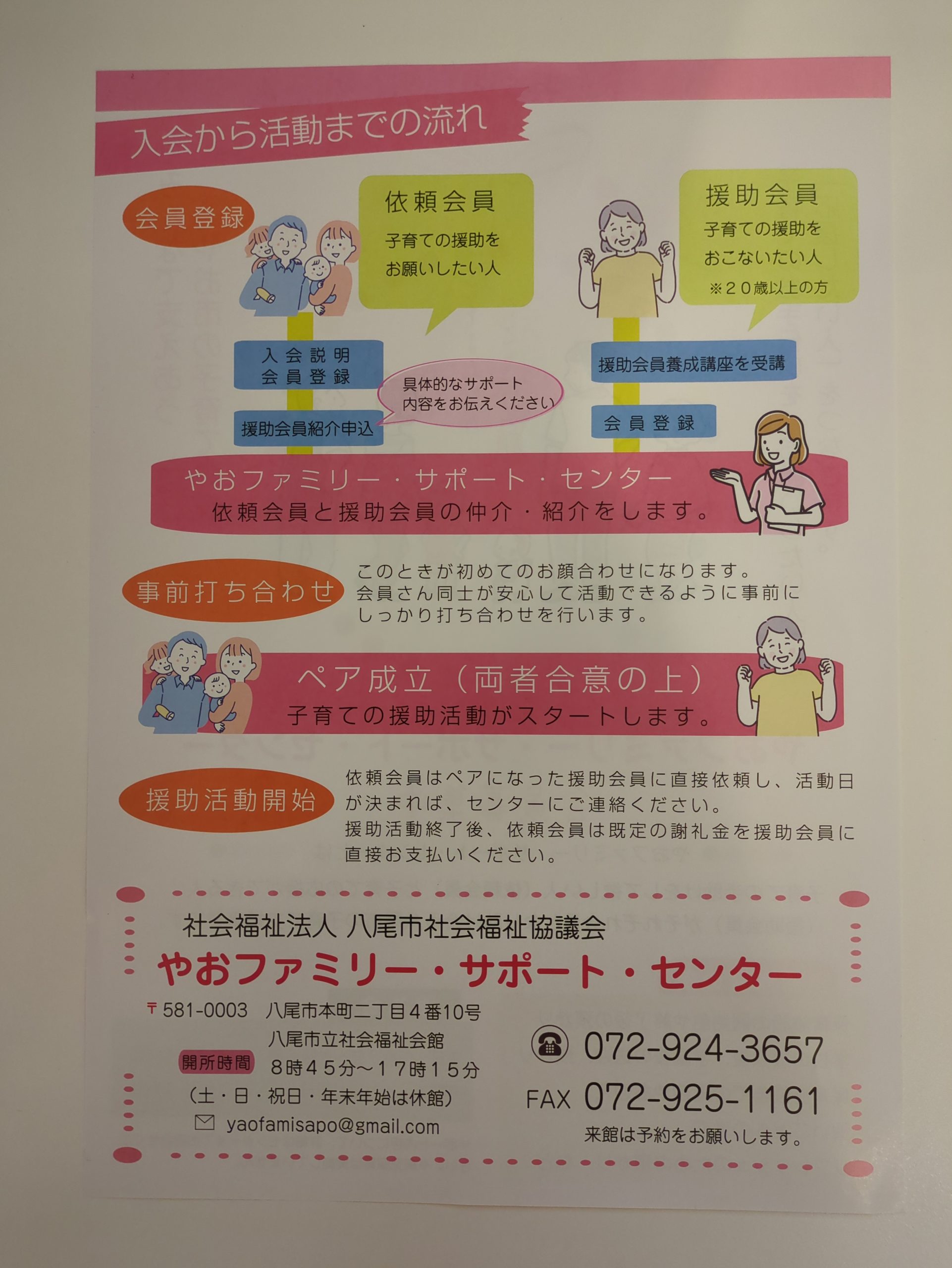子育ての手助けをして欲しい人(依頼会員)と子育ての応援ができる人(援助会員)がそれぞれ会員となり助け合う八尾市の子育て支援事業です。