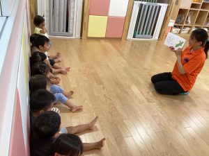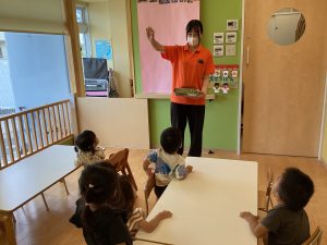 お豆の絵本を見た後は食育活動として地産地消の【八尾市の枝豆】を見たり、触ったりしました!