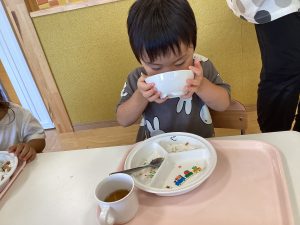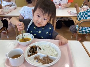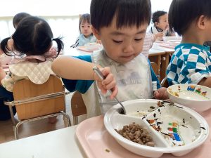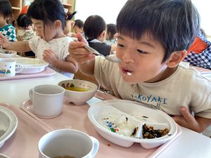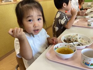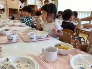 午前中いっぱい遊んだ後は、楽しみにしていた給食の時間です!
