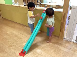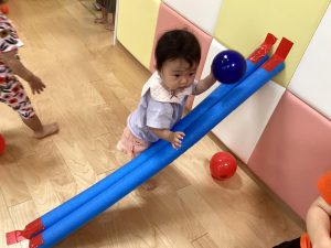 天井からぶら下がったフラフープに向かって「えいっ!」と声を掛けながら、ボールを上手に投げてくぐらせる姿も見られました✨