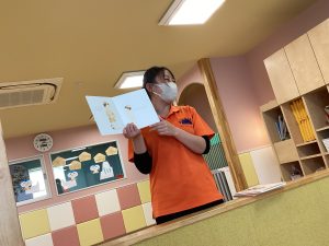 手遊びが終わると、「今日はね、トイレのお話の絵本だよ」と伝えると