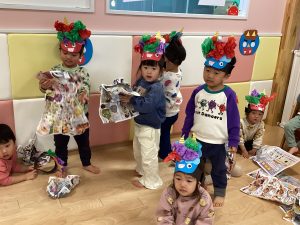 絵本を楽しんだ後は、いよいよ本物の豆まきタイム「おには〜そと!ふくは〜うち!」と掛け声をしながら、子どもたちは元気いっぱいに新聞で作った豆を投げていました♪