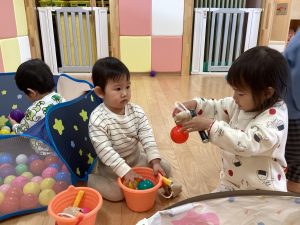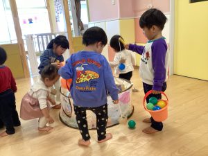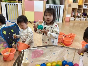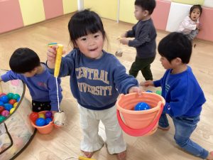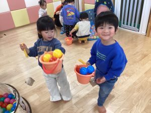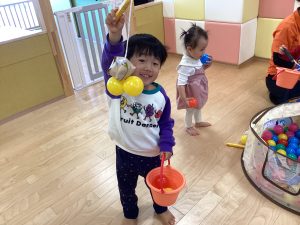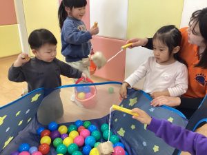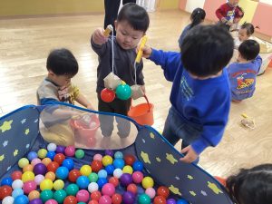 保育者が「今日はボール釣りをします!」と伝えると「やったー!」「早くやりたい!」と目を輝かせる子どもたちでした🥰