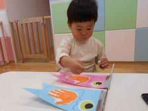 手形も上手でしたが、完成したこいのぼりに自分でシールをペタペタと貼って、