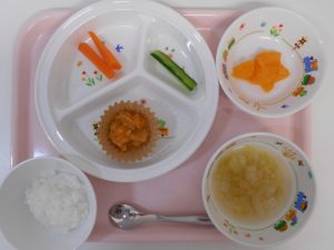 ・お粥 ・きゅうりスティック ・茹でニンジン ・キャベツのお味噌汁 ・そぼろ煮 ・オレンジ