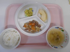 ・ご飯 ・キャベツのお味噌汁 ・すき焼き風煮 ・粉ふき芋 ・リンゴ