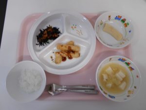 ・ご飯 ・お味噌汁 ・ひじきの炒り煮 ・カジキマグロのフライ ・バナナ