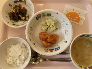 ご飯 肉団子スープ まぜまぜサラダ さつま芋の甘煮