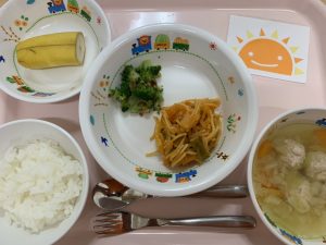 ご飯 肉団子スープ スパゲティソテー ブロッコリーのおかか和え バナナ