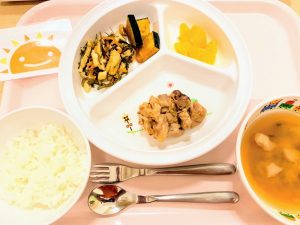 ご飯 味噌汁 ローストチキン かぼちゃの素揚げ 昆布の煮物 オレンジ