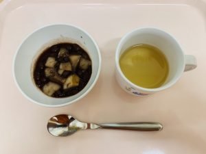 粥 味噌汁 おでん キャベツのおかか和え バナナ