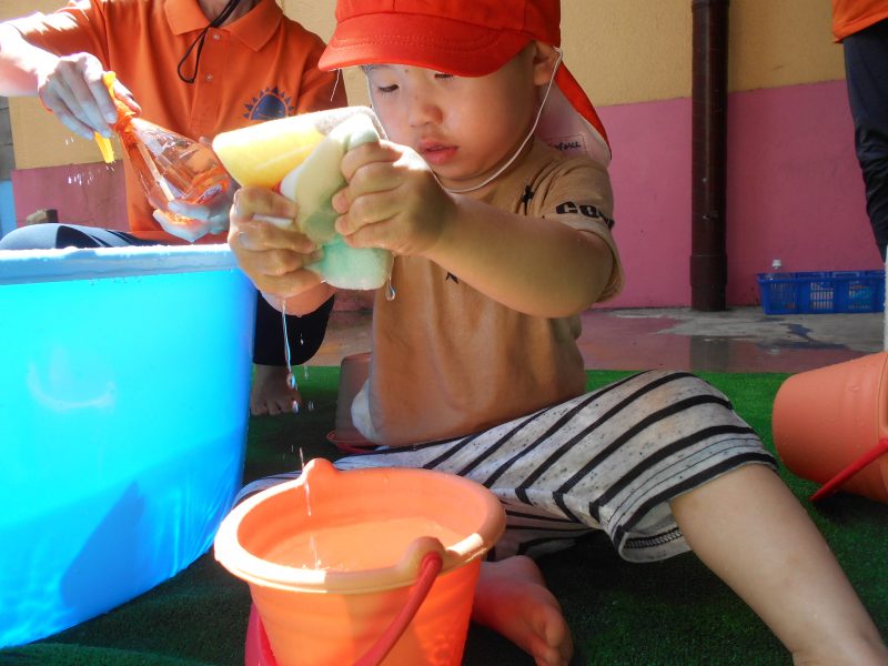スポンジに水をふくみ絞ることをおぼえ、繰り返し楽しんでいます?