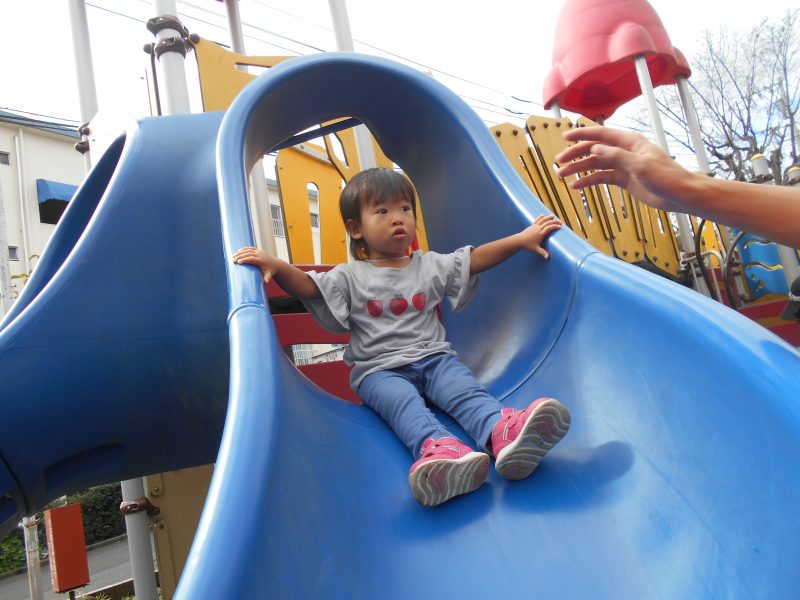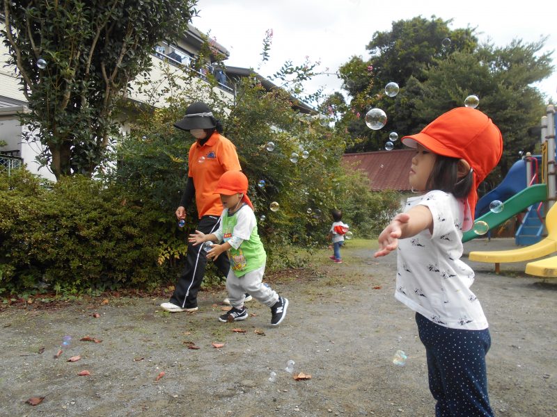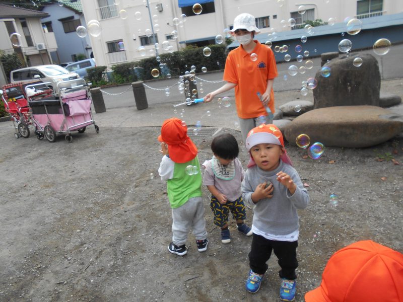 保育士と一緒にしゃぽん玉をしたり滑り台をしたり
