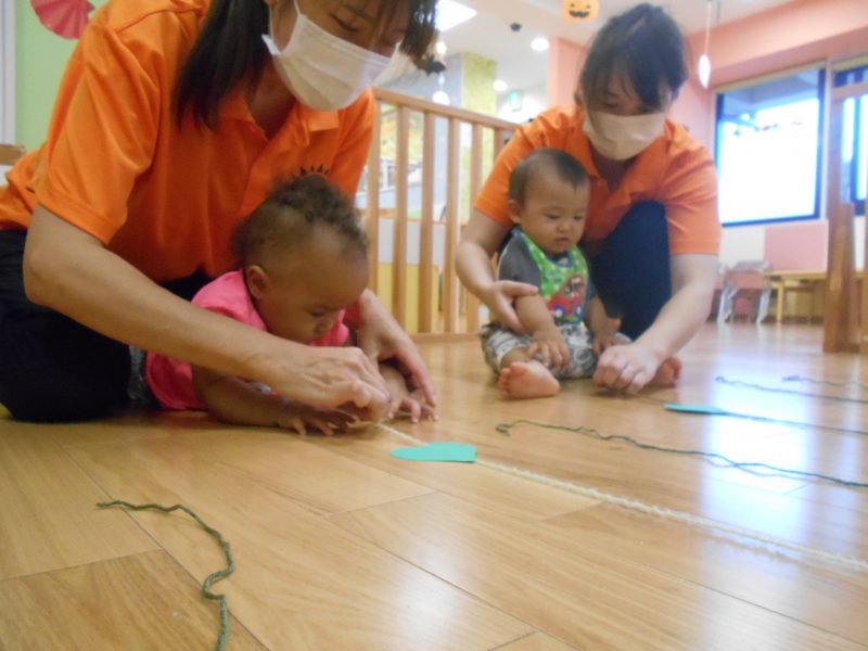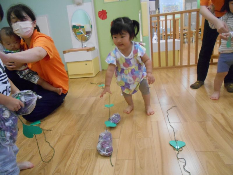 保育士に手伝ってもらって引っ張ります。
