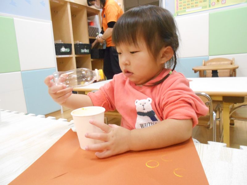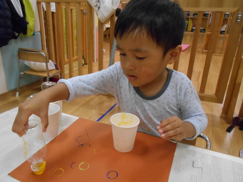紙コップに入った絵の具をペットボトルにつけて茶色の紙に模様を付けます。
