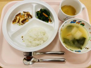 粥 味噌汁 豆腐と野菜のだし煮 ほうれん草のごま和え