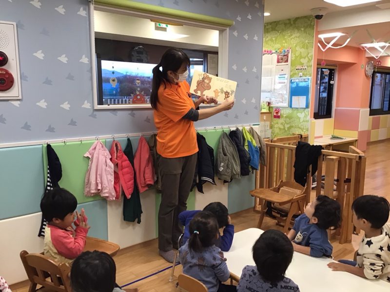 先生が読んでいる絵本を真剣に聞いている子どもたち、「ありがとうって言ってもらって嬉しそうだね」