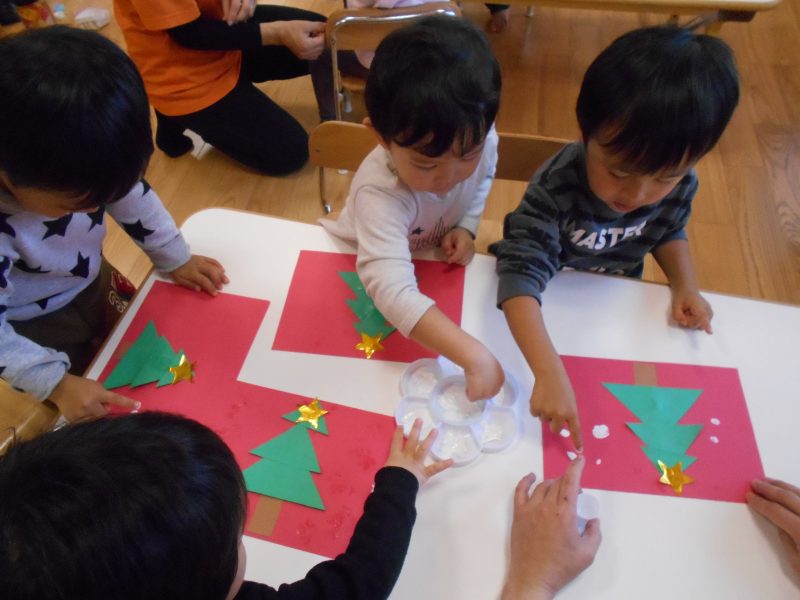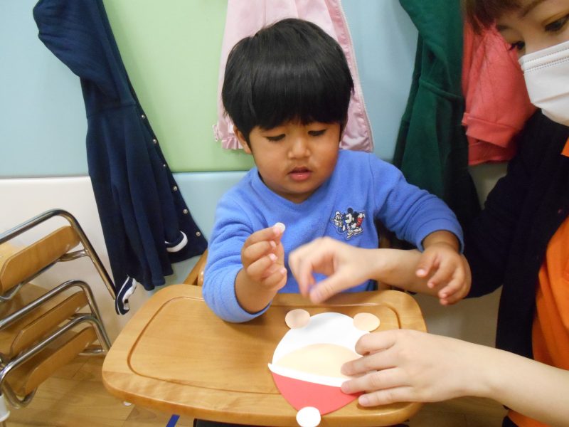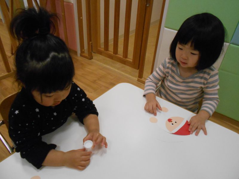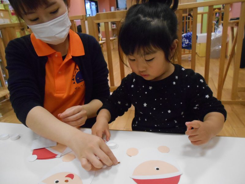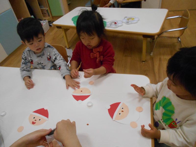 先生と一緒にクリスマスの製作を楽しみ、飾ってもらったサンタクロースをみては