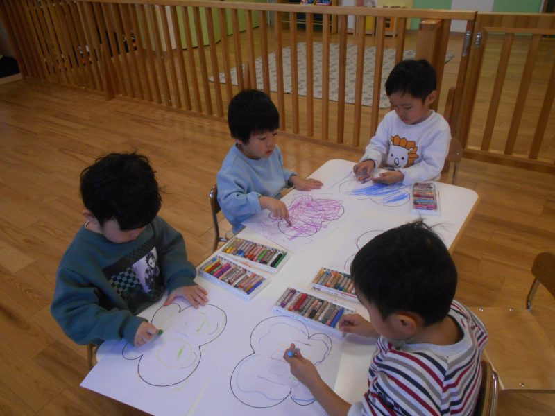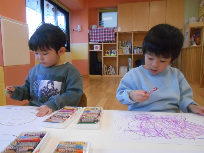 まずはちょうちょの枠の中にクレヨンでお絵描きです♪