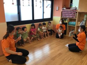 今日の絵本プログラムでは「ぴょーん」という絵本の読み聞かせの様子をお伝えします?